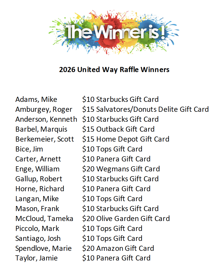 Please check the list below for this year’s winners of our 2026 United Way Raffle! Thank you for your donations!
