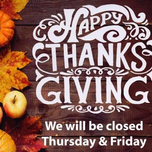 The office will be closed Thursday, November 27th and Friday the 28th for Thanksgiving.